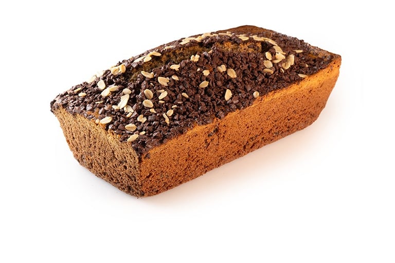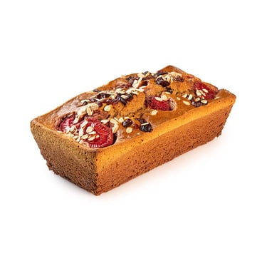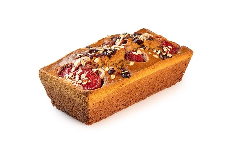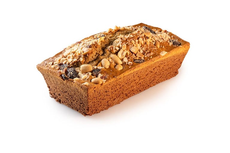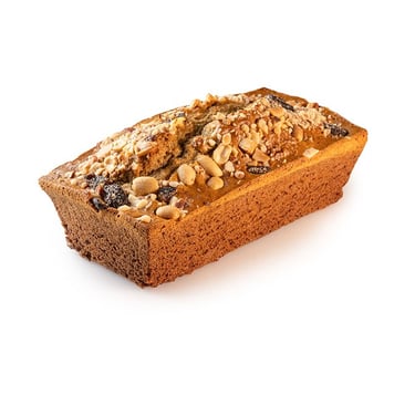 Torta de banano con aporte alto en grasas buenas por su contenido de almendras, maní, nuez del Brasil y arándanos.